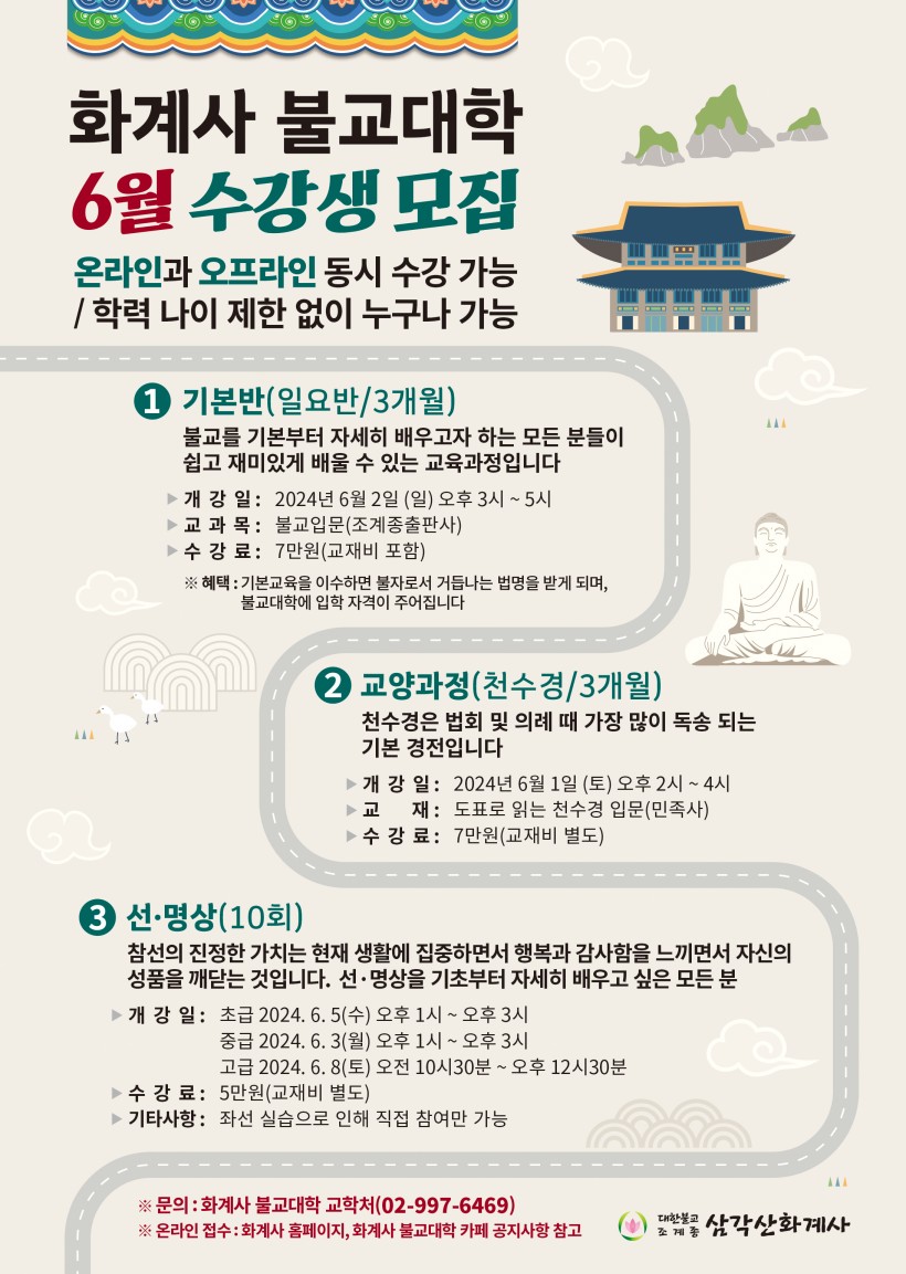 ※ 화계사 불교대학에서는 모든 강의를 온라인과 오프라인으로 동시에 진행하고 있습니다.